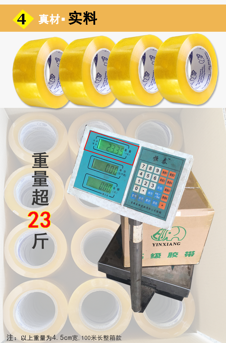 【商品品名】:BOP封箱膠帶【商品品牌:印橡\ yinxiang【商品寬度】:42、45、55、60cm【商品厚度】:1.8cm、2.4cm、2.6cm3.1cm(均含紙芯,±0.1cm)注:膠帶屬于包裝耗材,非精密儀器生產厚度有正負0.1cm的工業誤差屬于正常現象,不能接受誤差的請勿購買,以免造成不必要麻煩。【商品包裝】:54卷、36卷、30卷等【商品顏色}:透明、米黃、透明白【商品特征}:高粘性、強拉、抗老化【商品用途】:封箱物流打包等